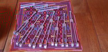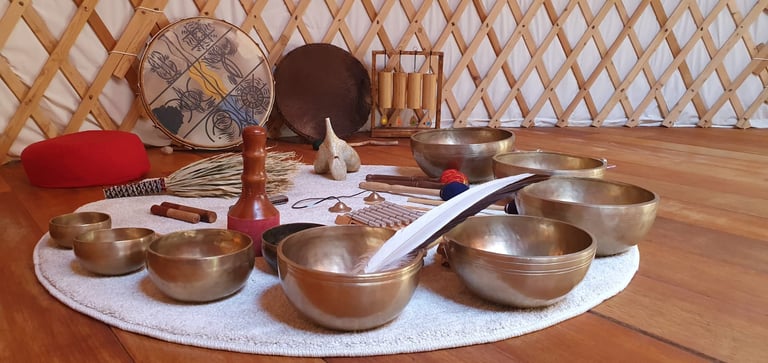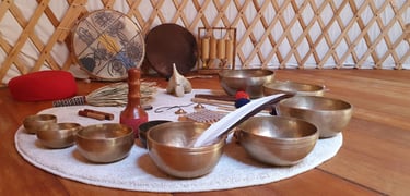 Various tools complement the sessions such as voice, touch, singing bowls, chimes (tubular and Koshi's), rainmakers, tuning forks, chakapa's, shamanic drums, shakers, rattle necklace, stone whistle (Innato), didgeridoo (learning) and the gong, the master teacher!